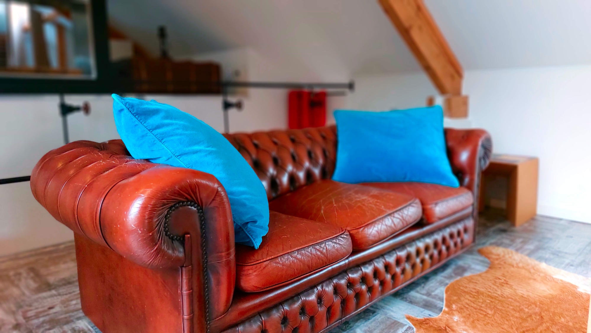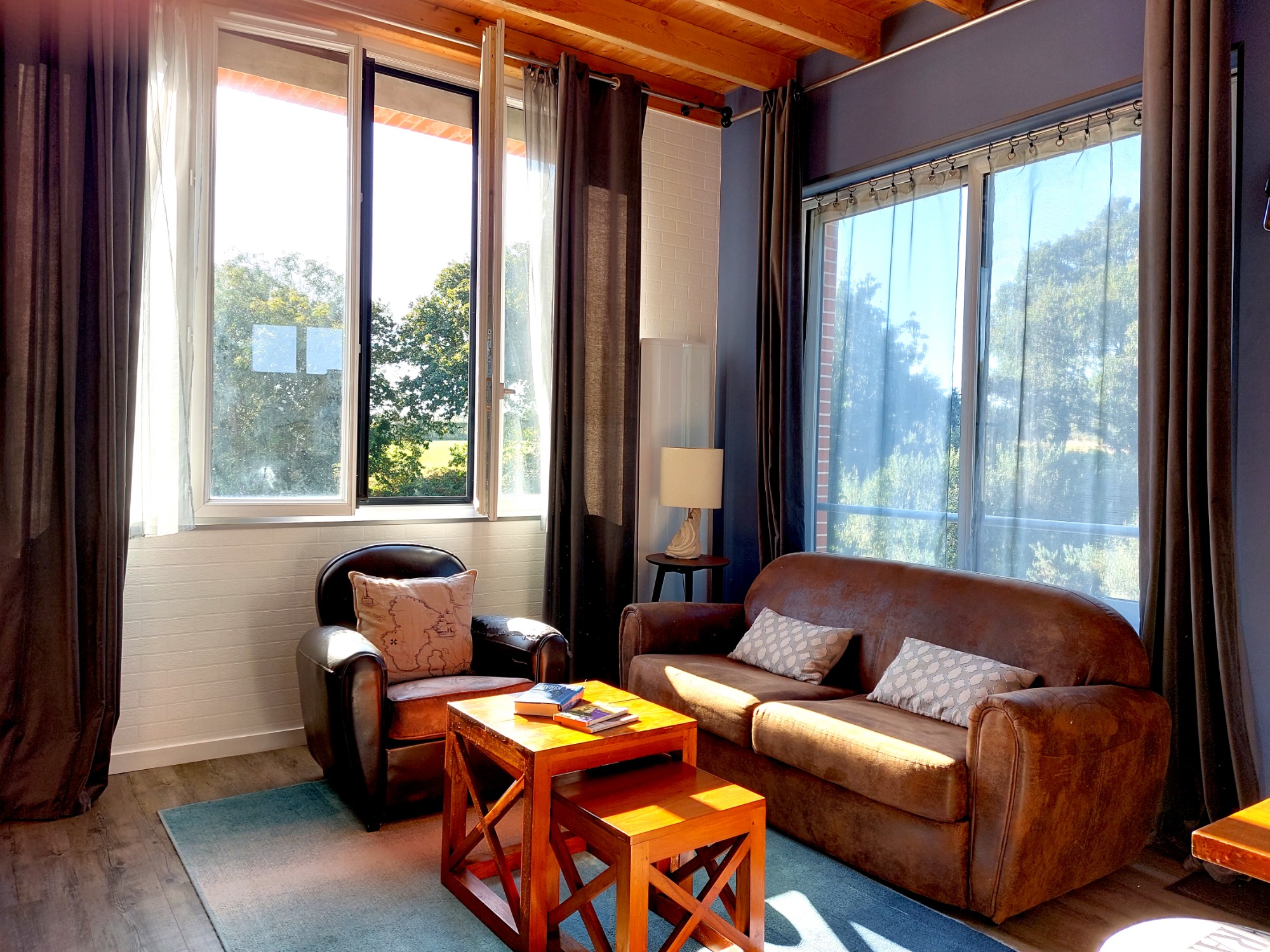 Imaginez un point de vue imprenable sur le bois et les champs environnants : vous êtes dans l'ancienne réserve d'eau de la Laiterie, sous les toits du bâtiment principal. Ce bel espace a été transformé en duplex de 60 m², tout équipé dans une ambiance chaleureuse avec le ciel et la verdure pour décor