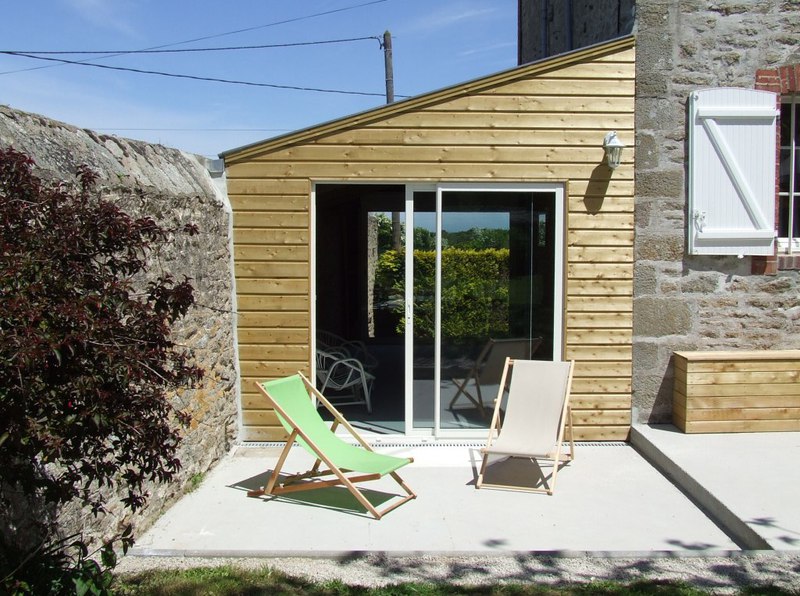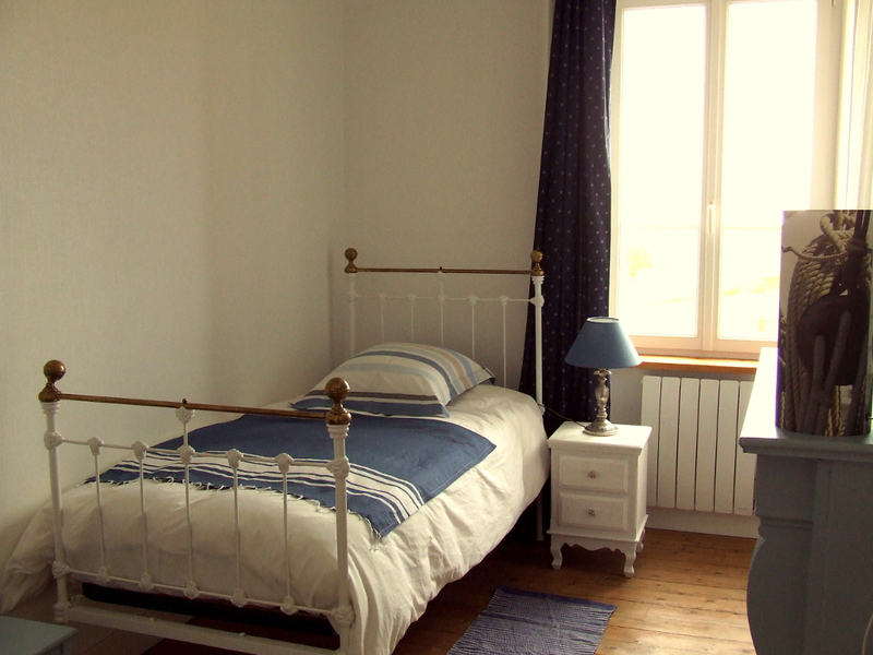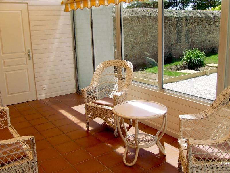 Le gîte accueille huit personnes au milieu d’un jardin clos de murs de pierres de granit. Un grand figuier fournit l’ombre, les hortensias leurs couleurs apaisantes et un terrain de pétanque, l’espace pour les sportifs ! La cour et le jardin sont parfaitement clos. Après l’effort, le réconfort d’un barbecue entre amis sera bienvenu, suivi par exemple d’une partie de baby-foot, d’une pause goûter dans la véranda ou de lecture devant la cheminée du salon, d’une séance de bronzage sur la plage… D’ailleurs, il y a de bonnes chances que vous soyez tentés par la mer, puisqu’elle est l’horizon de la fenêtre de votre chambre. La salle de jeux, plus fraîche en été grâce aux épais murs de pierre, a aussi l’avantage d’être légèrement isolée du reste de la maison : on peut y faire du bruit ou la sieste en chaise longue sur la terrasse !